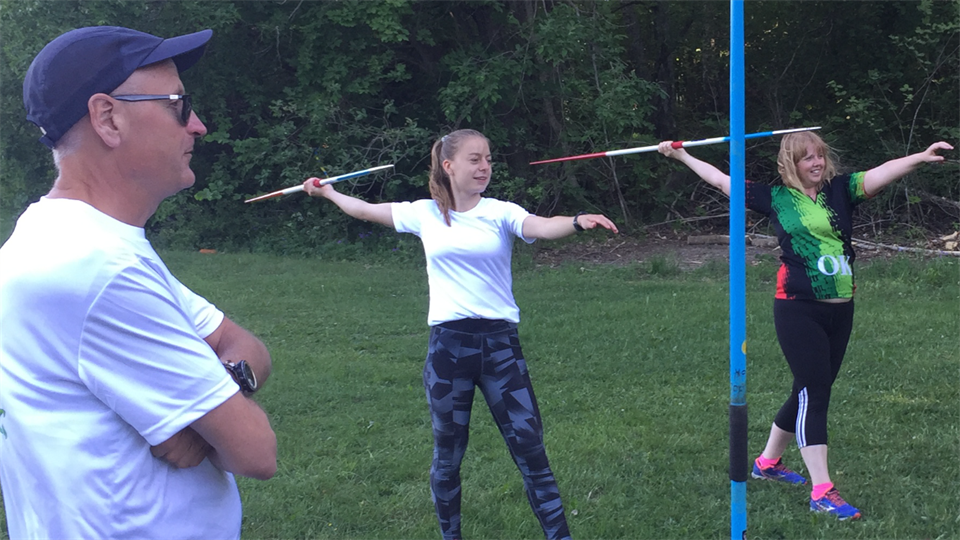Tillsammans med vår närmaste granne OK Enen uppmärksammade vi ikväll manifestationen Sverige på fötter. Ett litet gäng besökare provade på orientering, spjutkastning och häcklöpning medan många av våra löpare gav sig ut på en lugn jogg inför helgens Stockholm marathon och flera orienterare var ute på teknikträning. På bilden syns kasttränare Pasi med orienterare som tog vara på tillfället att prova på att kasta spjut.